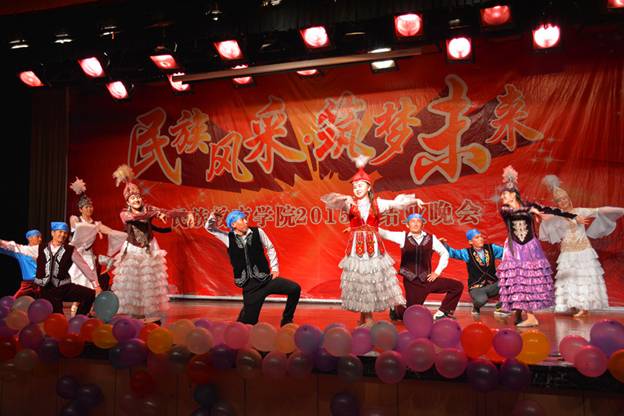 晚会正式开始前,首先进行了颁奖仪式,重点表彰了对在2014—2015学年度中表现突出的优秀学生、优秀学生干部,以及在民族团结活动月中表现优异的学生和集体。院长冯建新和党总支副书记窦文阳宣读获奖名单,学工部副部长芮国星、党总支书记郑生忠上台为获奖学生颁奖并合影留念。接下来,在一曲哈萨克传统舞蹈《恰熟》中,晚会正式开始。歌舞《中国我为你歌唱》、合唱《爱我中华》表现了当代青年学子朝气蓬勃、积极进取、昂扬向上的新形象;预科同学带来的舞蹈《吉祥谣》、《萨吾尔登》、《刀郎舞》、《梦幻花园》、《赛马舞》、《异域风情》展示了我院少数民族同学能歌善舞、多才多艺的一面,也向我们展示了各少数民族独有的民族风采和异域风情;民硕同学带来的《希望之光》、《青春·印记》、《假面奇迹》,将晚会推向高潮,使我们在动感十足的舞蹈和音乐中感受了一股青春律动的气息和对理想的执着追求;乐队《离不开月亮》、歌舞剧《A night to remember》、B-box+乐队《公路之歌》等节目以别样的形式和新颖的设计,引起全场的热烈掌声。每一位表演的学生都在用他们的努力和汗水向青春致敬,感念在师大这一年的学习与生活。最后,由在我校第十三届star擂台总决赛中获得“star之星”的天山儿女组合带来的精彩歌舞,晚会顺利落下了帷幕。