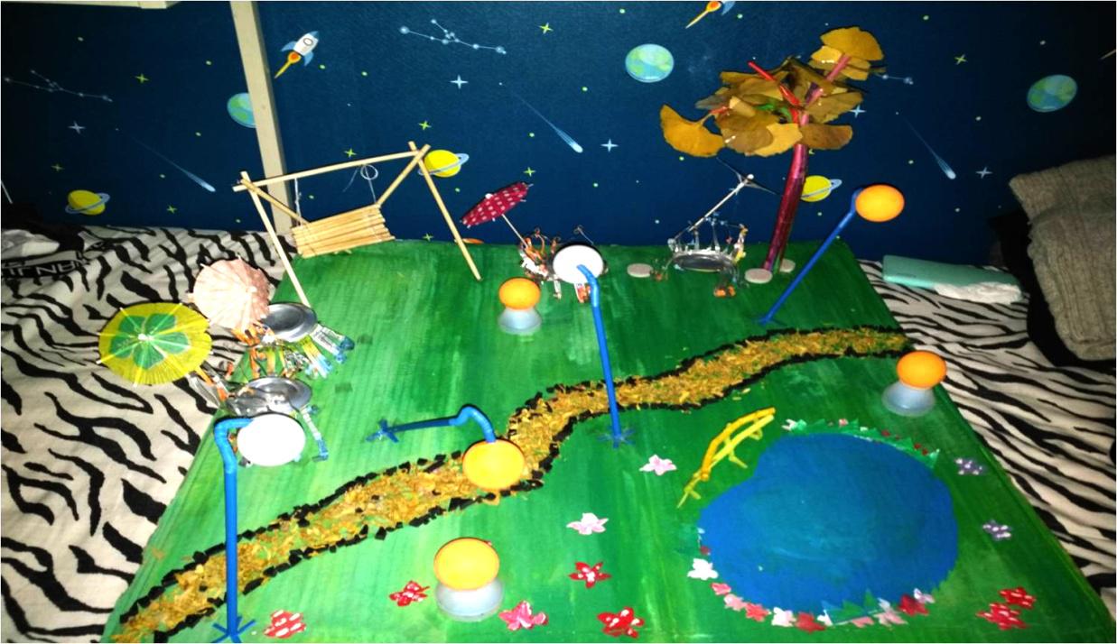 手工艺品众多作品中共有19个作品进入评选环节。评选中,主持人马璇同学为大家播放幻灯片,详细介绍了各班同学利用废弃品制作的手工艺品。同学们充分发挥自己的想象力,让本已毫无价值的废品获得第二次生命,有废纸盒制作的精美收纳盒、一次性纸杯纸做的玲珑装饰品、废报纸插出的独特花束等等,它们外观静美,做工细腻,创意独到,很好的诠释了本次活动的主题,拓展了学生的发散思维和动手实践能力。手工艺作品中最具吸引眼球的有两个作品,预科3班萨达·阿依努尔古丽等人制作的婚纱作品,她们利用衣架做婚纱的群撑,用蚊帐做蕾丝裙和头纱。预科6班阿力木·艾尔肯为自己制作的巨人起名为“ROBOT”,他利用废弃的纸盒,亲手设计、粘贴、图画出一个高大身躯,臂膀魁梧的机器人,在手中插着的红旗代表飞扬的中国梦——预科梦。