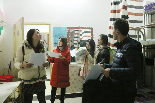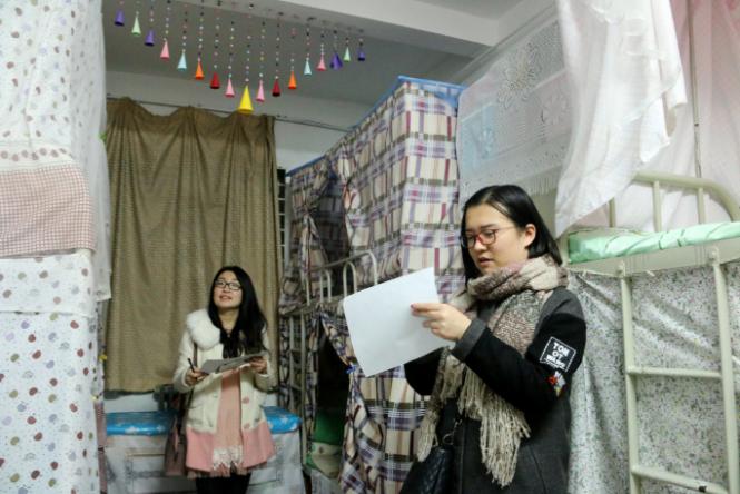 12月21日晚七点,我院如期进行以“展民族魅力,建和谐寝室”宿舍文化节活动之“室全室美”活动的第三轮评比环节,参与评审的有新疆内派服务管理教师迪丽努尔、赵雪艳、辅导员热依木、兼职辅导员蒙桂芳、刘雅丽以及学生会生活部的全体成员。参加评比的有全体少数民族预科生宿舍。