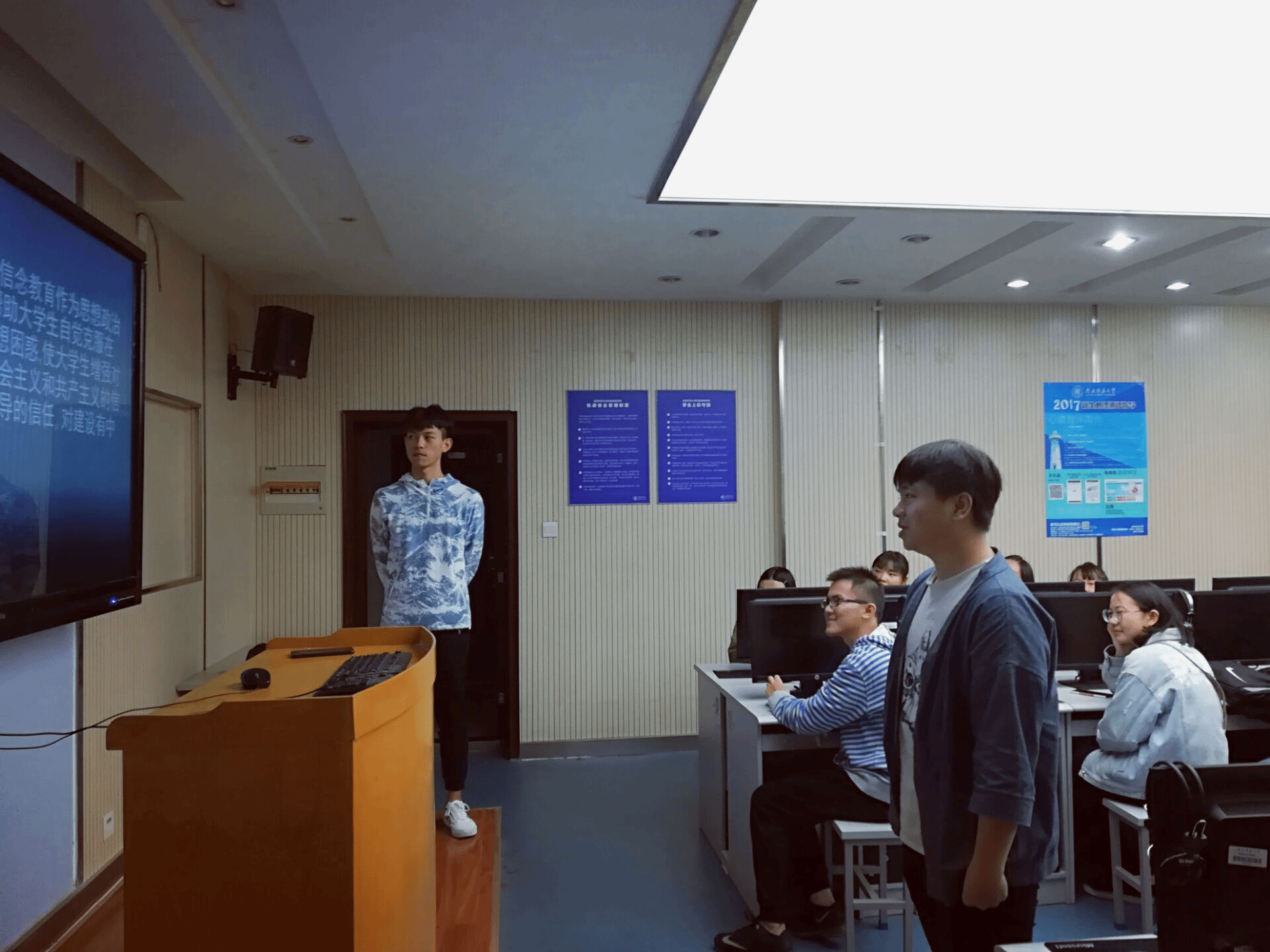 3、预科三班和四班的主题班会同样是别具一格,开始随着法制短片的播放,同学们心底对法律的敬畏之感油然而生。紧接着同学们纷纷积极踊跃地发表了观后感,如库热西同学、凯德尔丁同学等。有同学的言语令人捧腹大笑,但大笑过后又领悟到更深层的道理。班会进行得热火朝天……最后在兼职辅导员的总结下,学生们表示学生不能轻易被网上的手段欺骗,应该时刻保持清醒,不要攀比,考虑自己的实际情况消费,不能陷入网贷这个黑洞,毁了自己美好的前途!(附图 6 、7 )