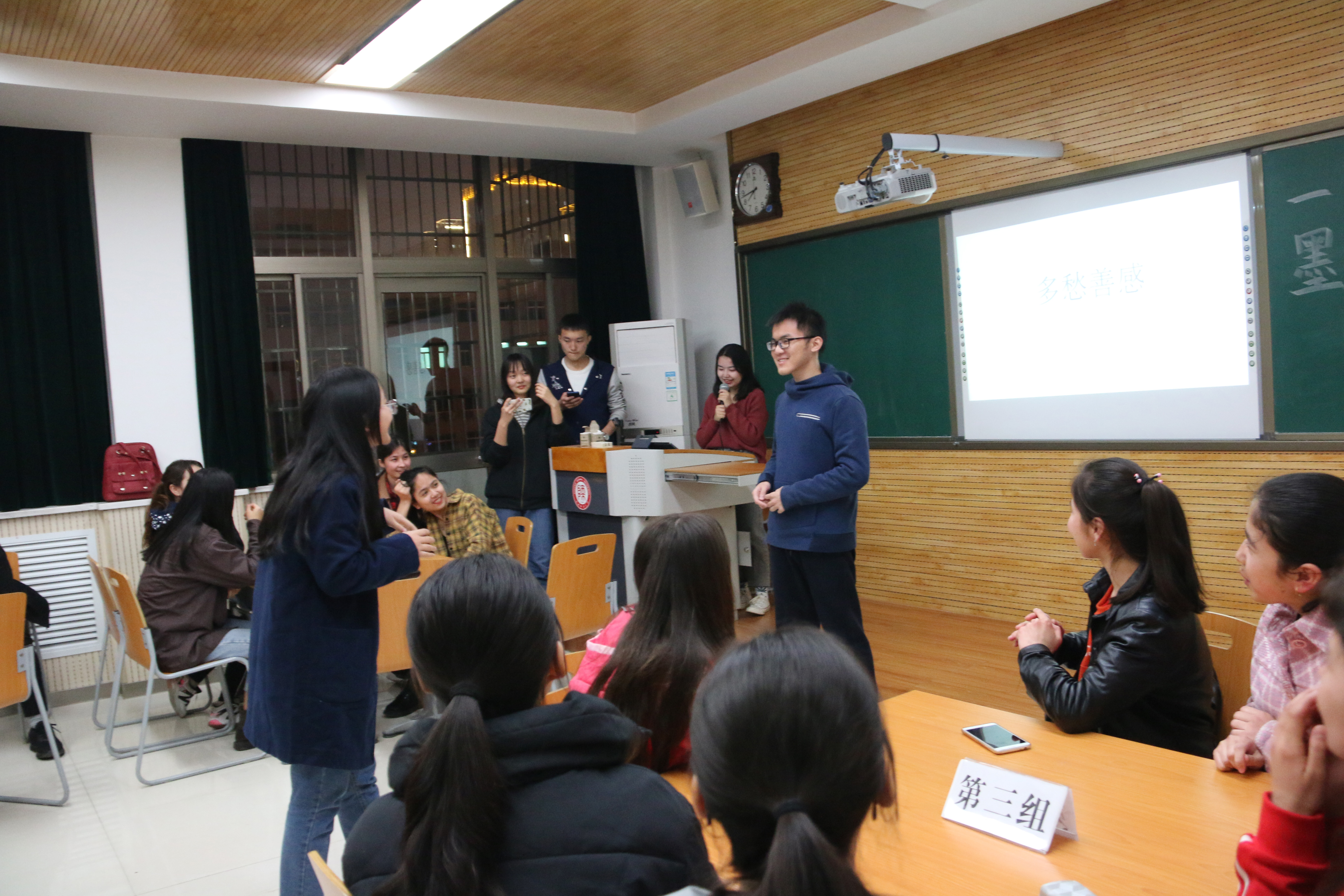 读书会开始,主持人向同学们介绍本次活动的规则与评分标准,随后四个小组的成员开始按顺序进行角逐。第一个游戏为成语竞猜,在场各个组都派出两位组员作为代表,一位负责比划动作,另一位则说出队友想要表达的成语。在这轮游戏中,组员们都使出浑身解数,手舞足蹈蹙眉凝思,引得现场观众欢笑连连。接下来进行的游戏是方言传话,各组组员一齐上阵,交头接耳,大家都努力将信息尽快完整地传给队友。既紧张又刺激的方言传话游戏使得现场活动氛围十分热烈,于是在同学们的欢声笑语中大家迎来了第三个游戏——谜语竞猜。这个游戏由主持人说出谜语,各组按顺序猜出谜底,规定时间内答对最多的获胜。同学们丰富的知识储备,使得准备的谜语早早猜完,只好当场搜索新谜语提问。最终的环节是成语接龙,现场各组同学积极参与,表现精彩,将活动推向一浪浪高潮!值得一提的是,第四组的组员凭借本身丰富的课外阅读知识在谜语竞猜和成语接龙两轮游戏获得胜利,这也从侧面说明了阅读可以助长我们的经验,促进我们自身知识的积累。