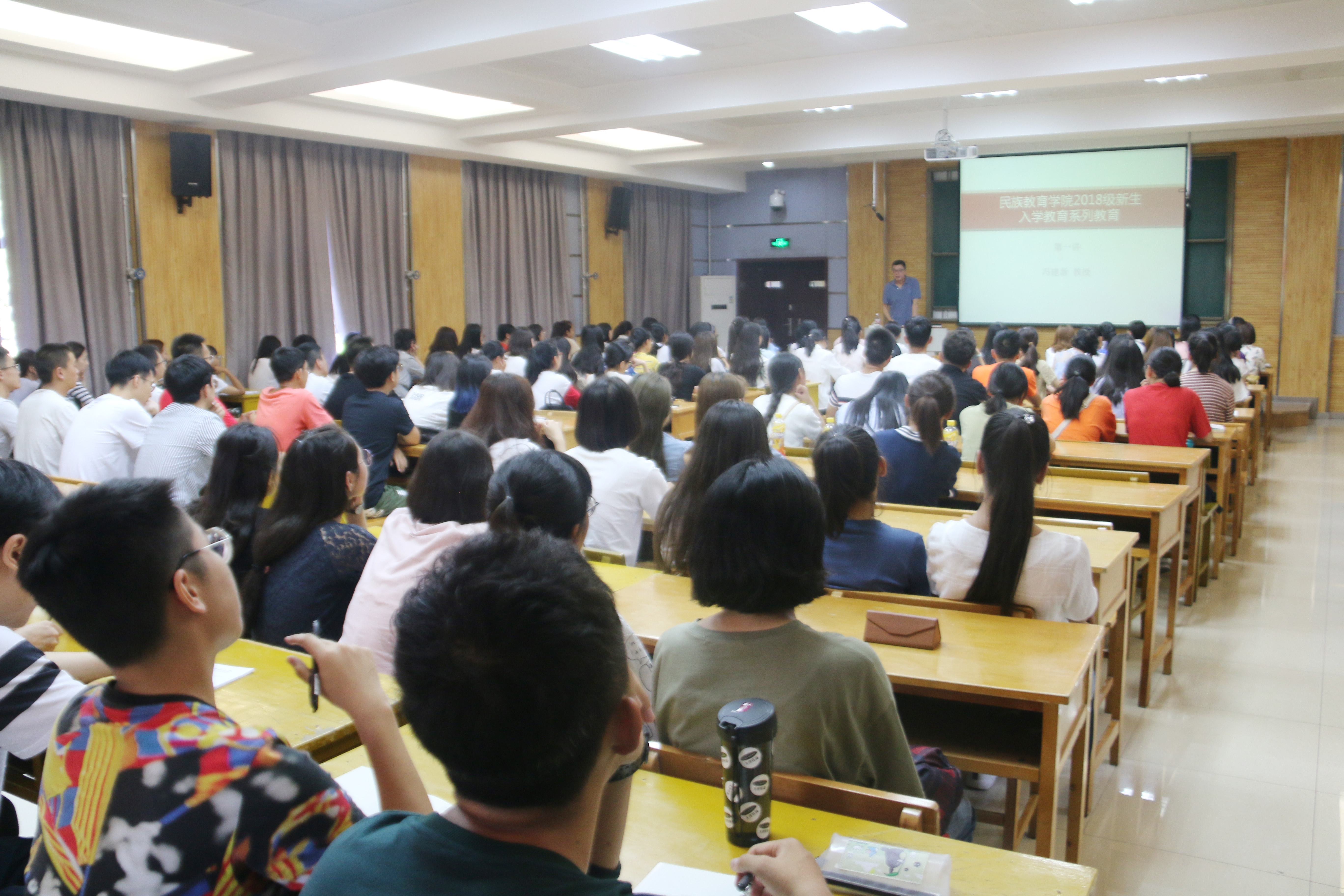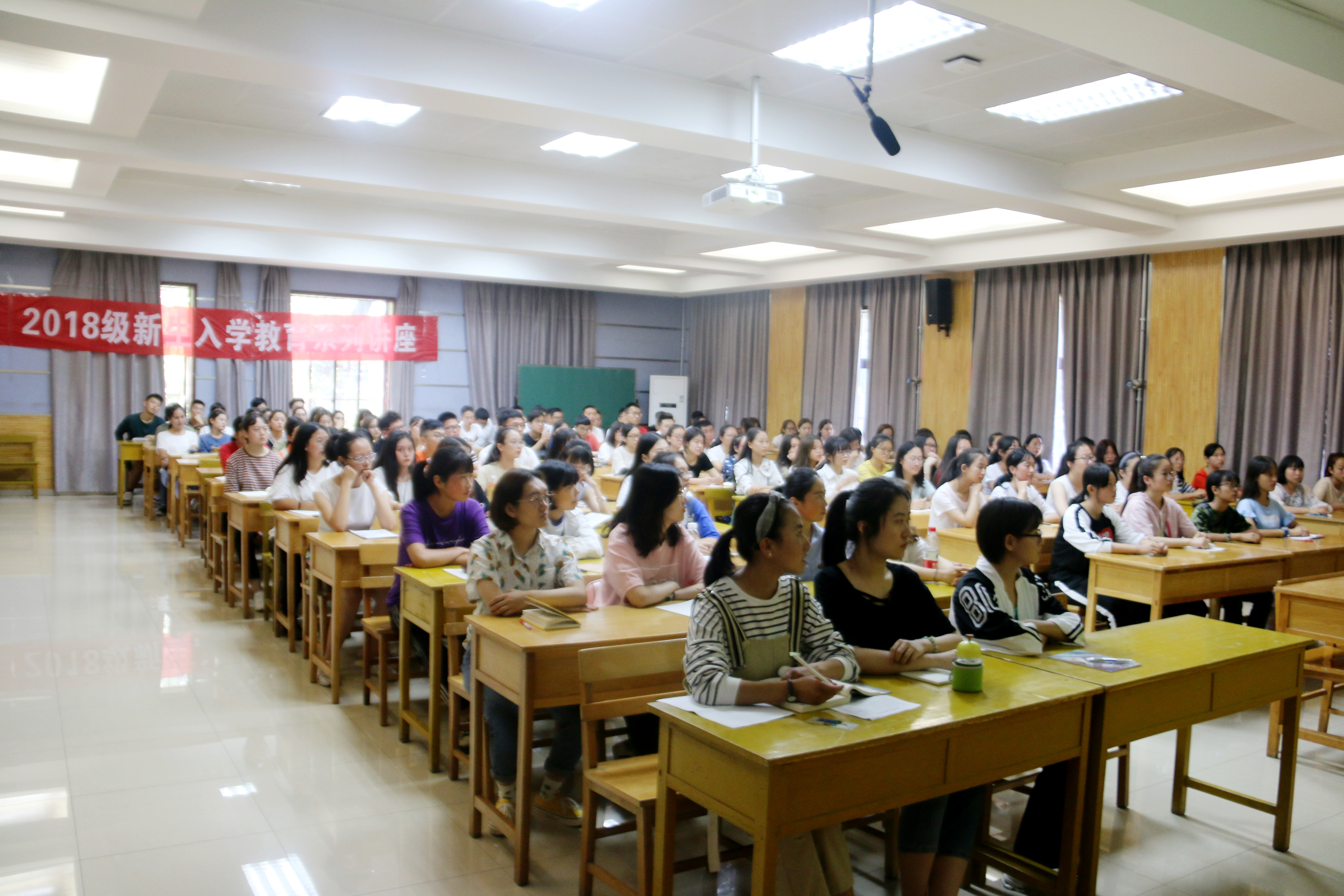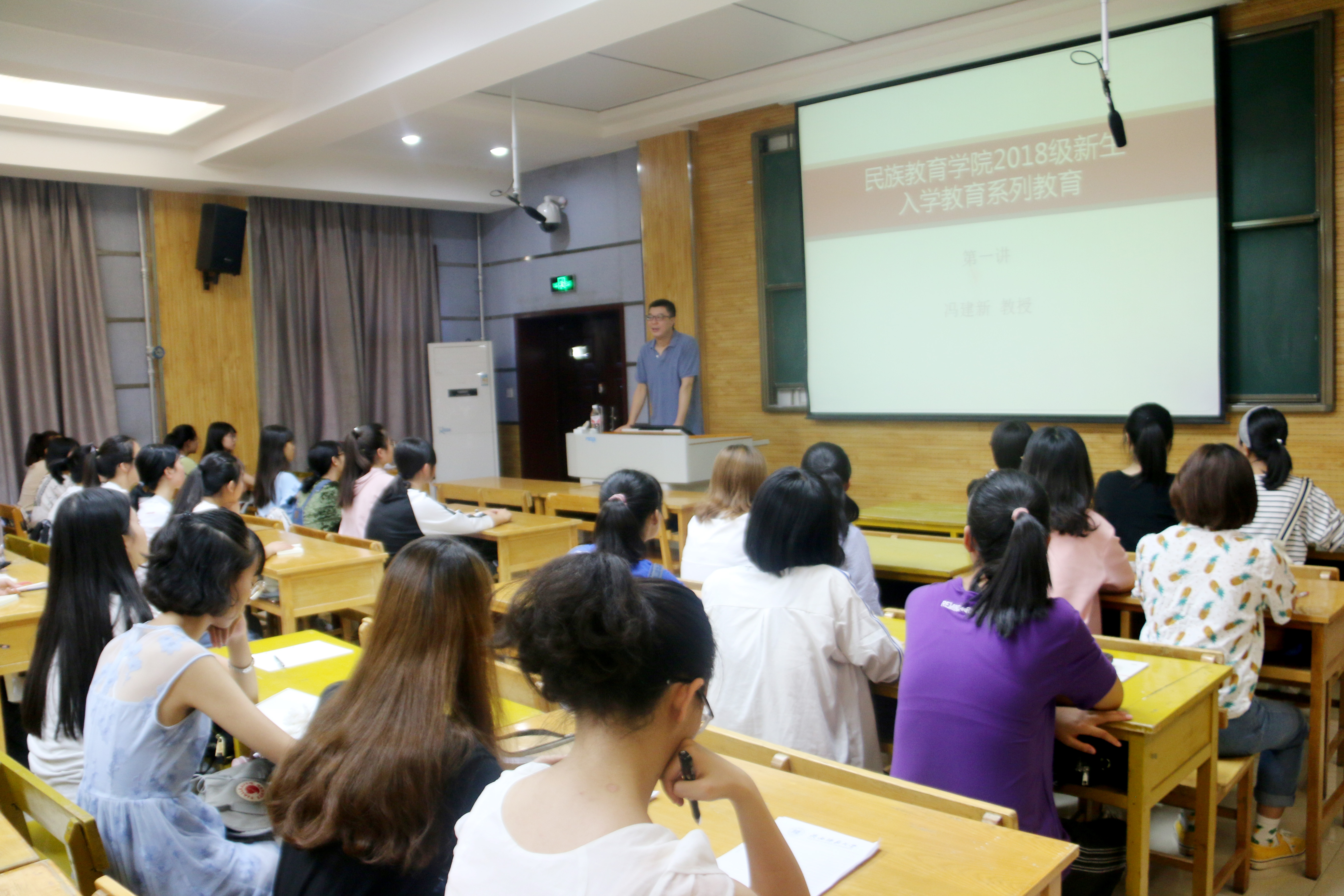 院长冯建新主讲,专职辅导员热依木主持,2018级全体新生参加讲座。