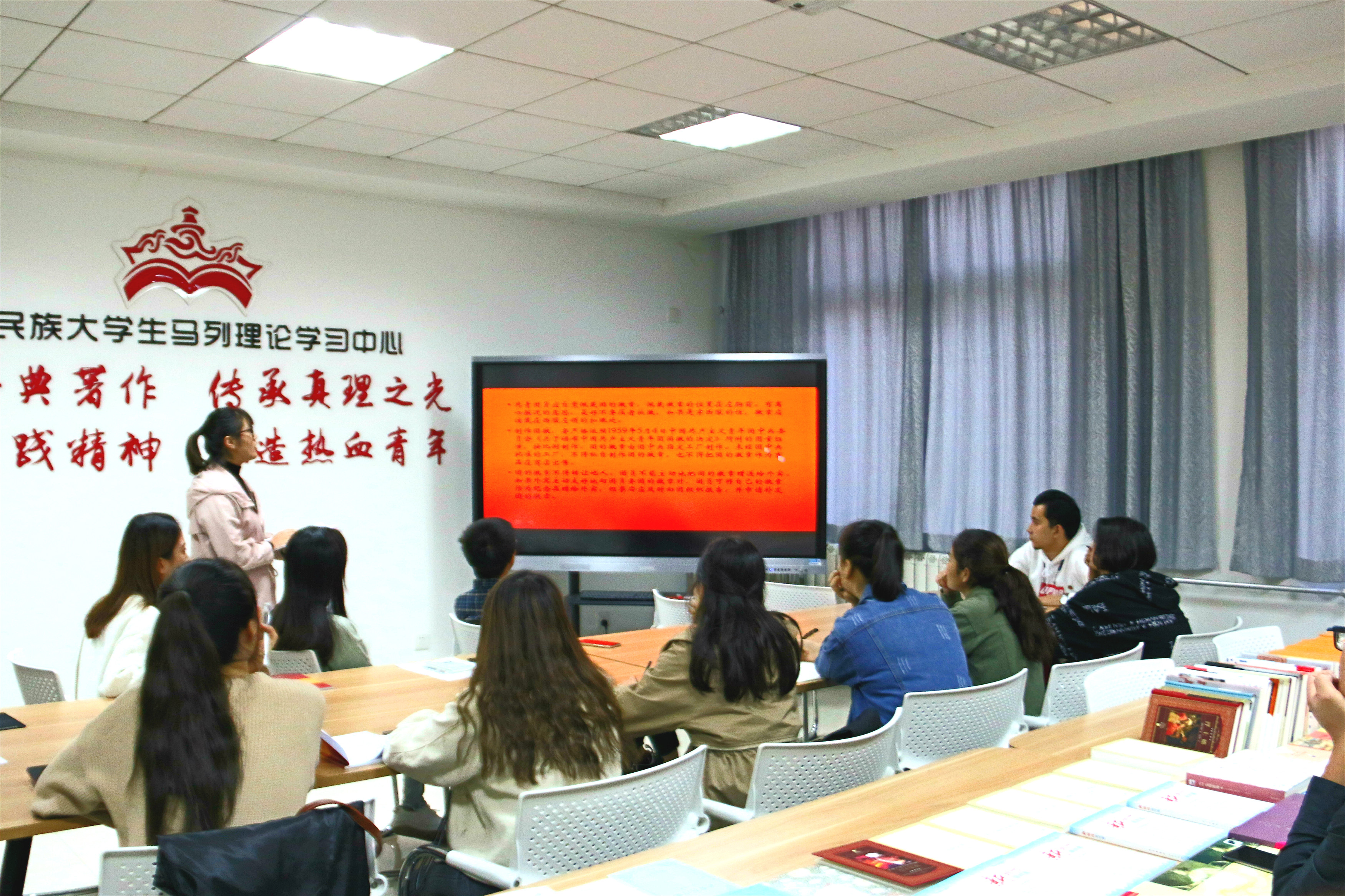 为使团组织和青年团员的联系更加密切,青年团员之间的沟通更加紧密,我院于11月2日下午4点在少数民族大学生马列学习中心开展了一堂集体团课,由团支部副书记周杨洁同学主讲,前来听讲的人员有各班班长、团支书和学生会学习部以及兼职辅导员王国昌老师。本次团课主要有三方面的内容:“共青团”、“新时代,新任务,新青年”、“我们的新目标”。