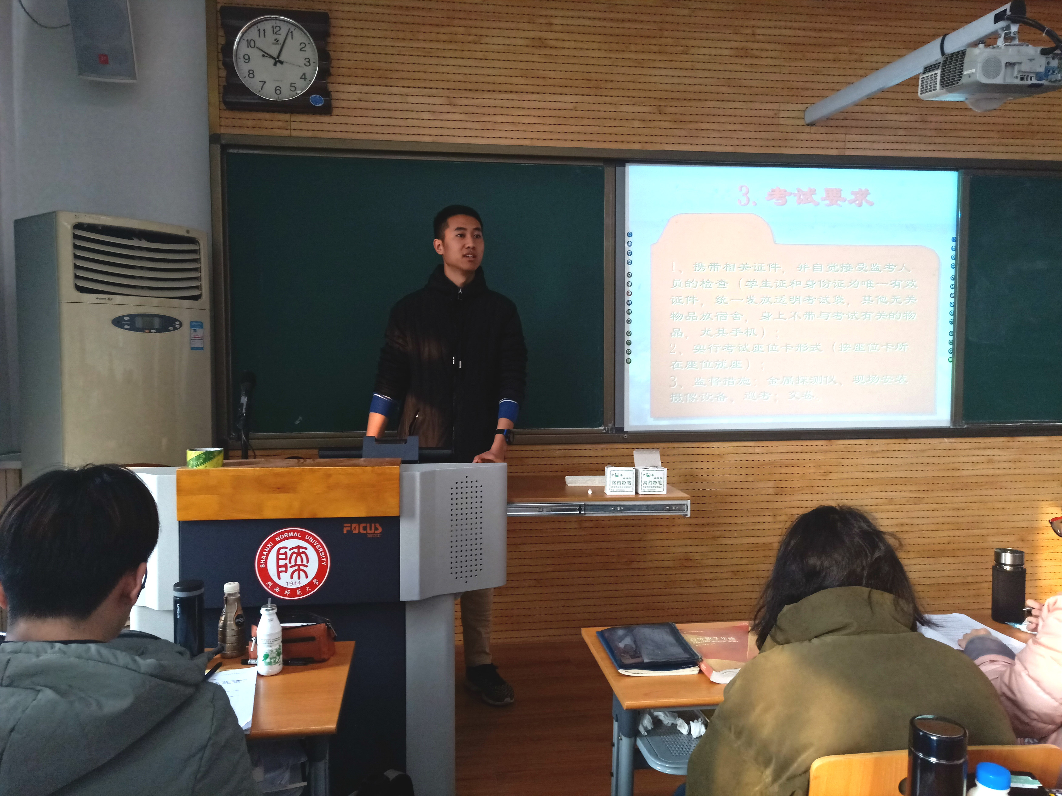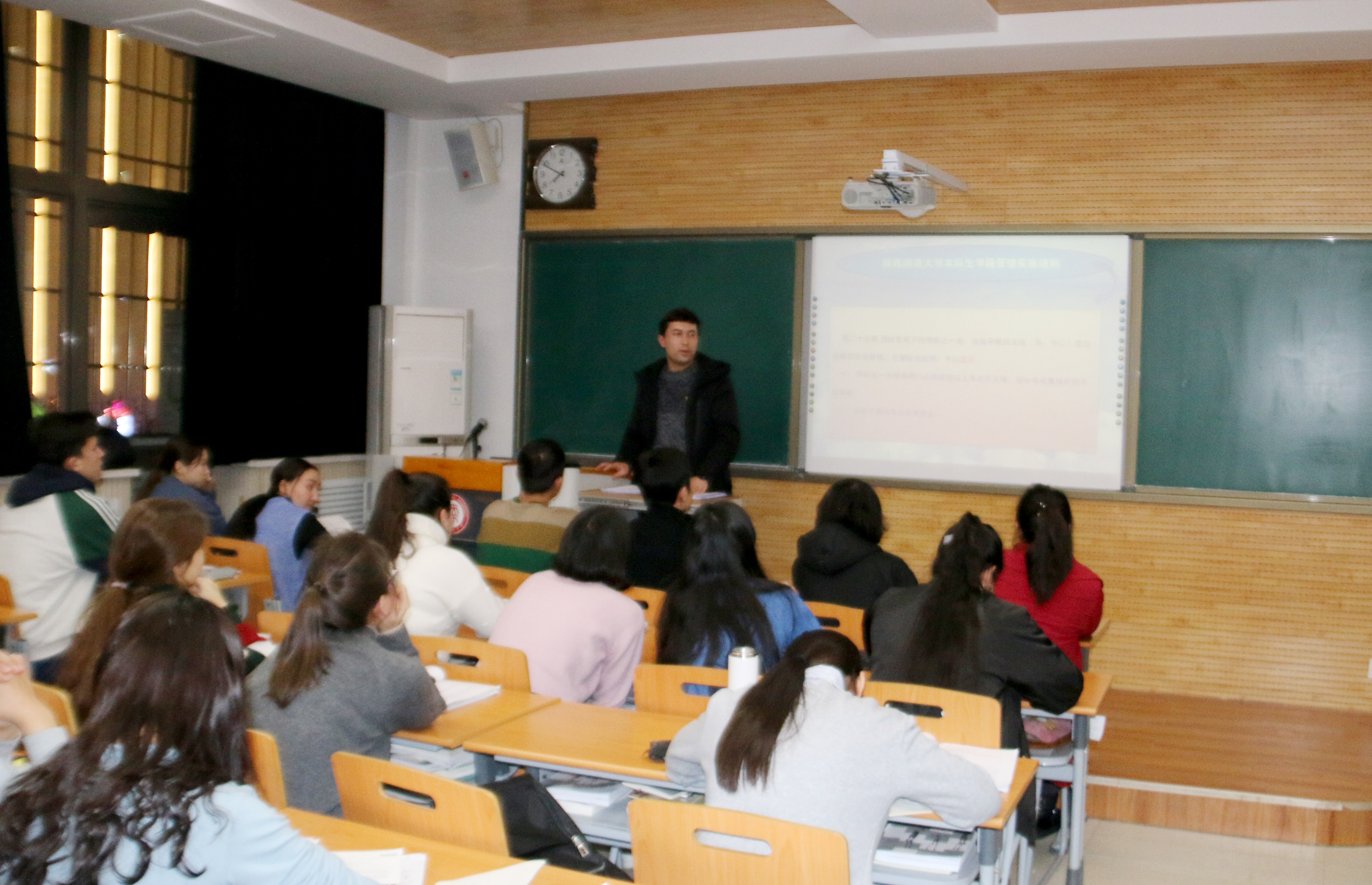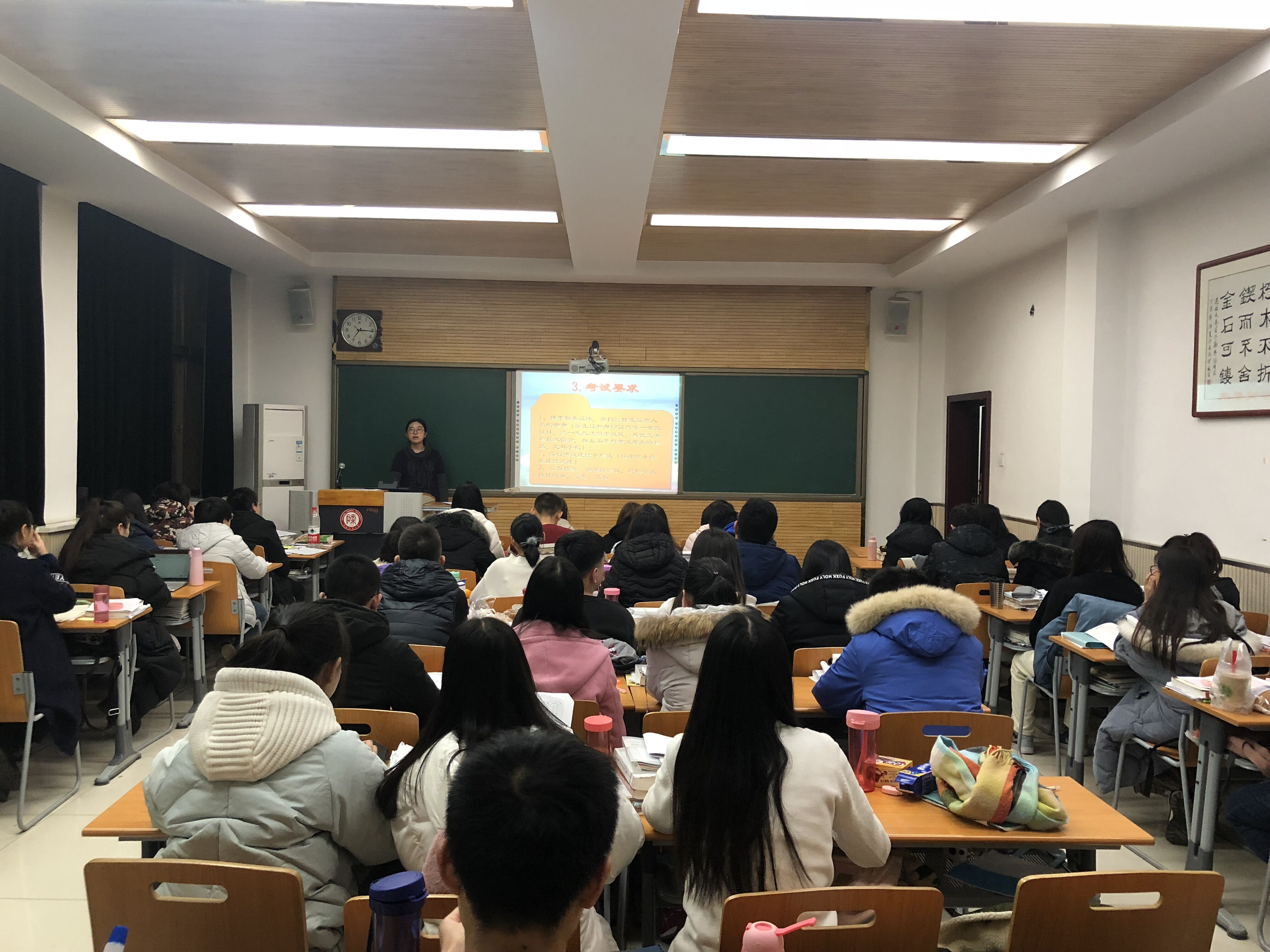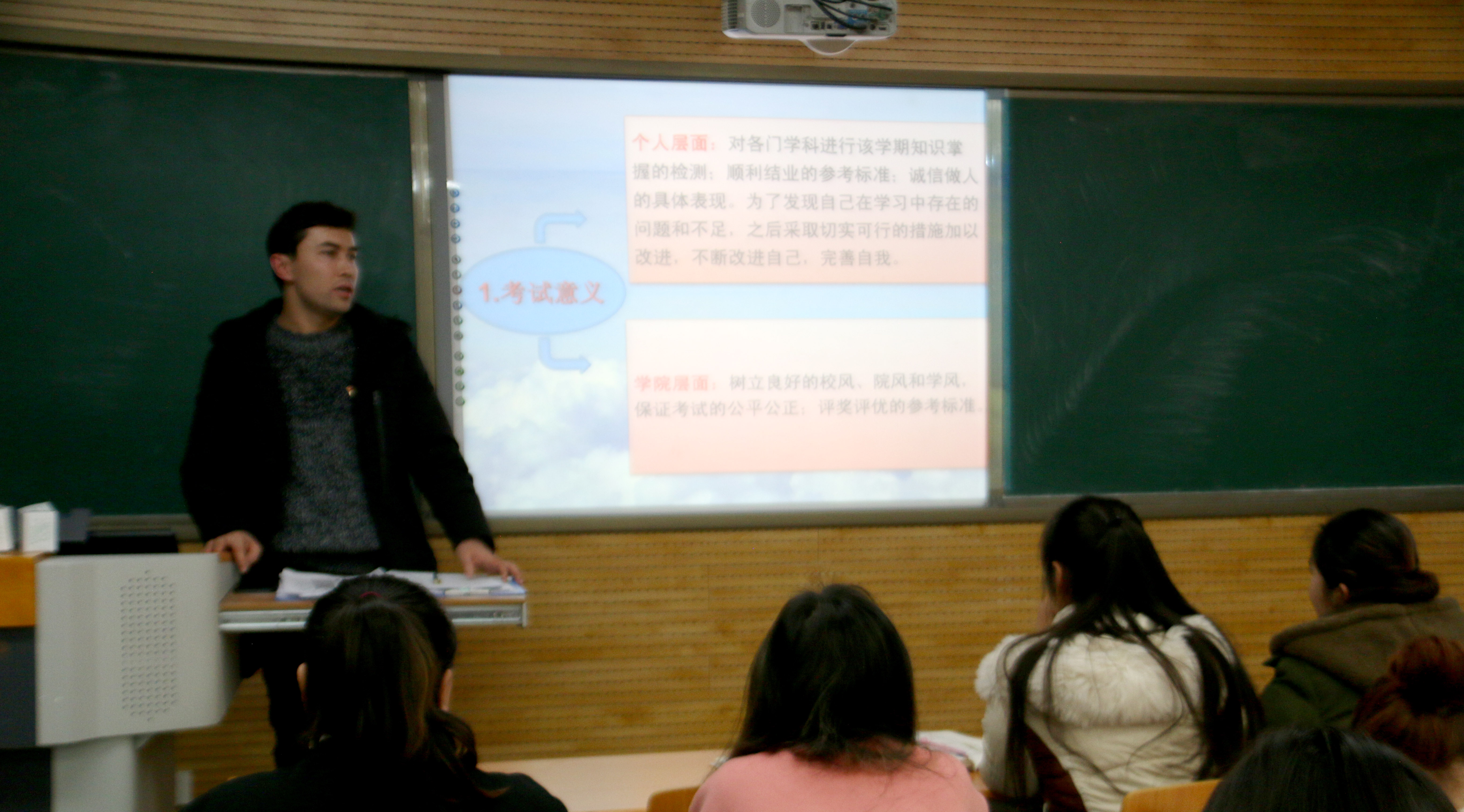 学生违纪处分规定》条例来进一步说明,嘱咐同学们一定要合理的安排时间认真复习,把握基础,真正将知识学到手,为未来的专业学习打下坚实的基础,积极践行以“爱国、求是、团结、奋进”为核心的民教精神,并预祝同学们争取获得满意的成绩。热依木老师指出结业清考已经取消,要求同学们严肃考风考纪、珍惜参考机会、认真对待考试。他还强调了学生寒假实践、撰写读书笔记、家乡新变化、预科感想及社会实践问卷调查等学习与实践活动的安排,对本学期放收假时间和请假流程、学生购买火车票、寒假安排、假期安全等事宜给予了详细说明。最后,为每一位学生发放考试用具装放的透明文件袋,同学们签订了考试承诺书。