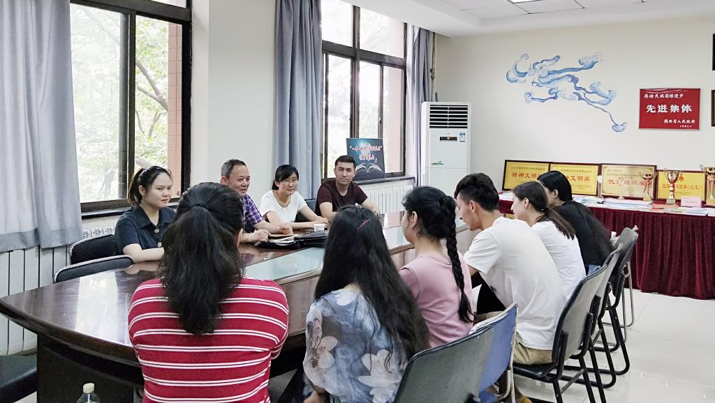 辅导员热依木首先代表学院对新疆内派服务管理教师买买提·热合曼老师的到来表示欢迎并一直以来新疆内派服务老师对我校少数民族学生工作的支持和帮助表示衷心感谢,并希望买老师凭借高校少数民族教育管理的丰富经验,更加精准、切实地为我校新疆少数民族同学提供服务与帮助。
