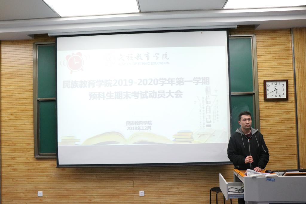 为严肃考风考纪,倡导诚信考试风尚,进一步落实学院学风教育,加强学风建设,发挥学生工作的主动性、积极性和示范性,动员全院预科生以更加饱满的状态迎接期末考试,12月16日下午,我院于雁塔校区五号教学楼5101教室召开2019-2020学年度第一学期期末考试动员大会。我院党总支副书记窦文阳、团总支书记赵超、专兼职辅导热依木、许珊、冯祎洁以及全院137名预科生参加会议,会议由学院专职辅导员热依木主持。