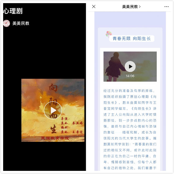 我院学生于5月原创编剧排演拍摄心理情景剧《向阳而生》,该剧主要讲述主人公向阳从进入大学时懦弱胆怯,到一步步战胜内心懦弱与恐惧,战胜心魔,成长为自信阳光的当代优秀大学生的故事。该剧在学院公众号发布后广受老师和同学好评,并将在学院年度综合表彰大会上放映。