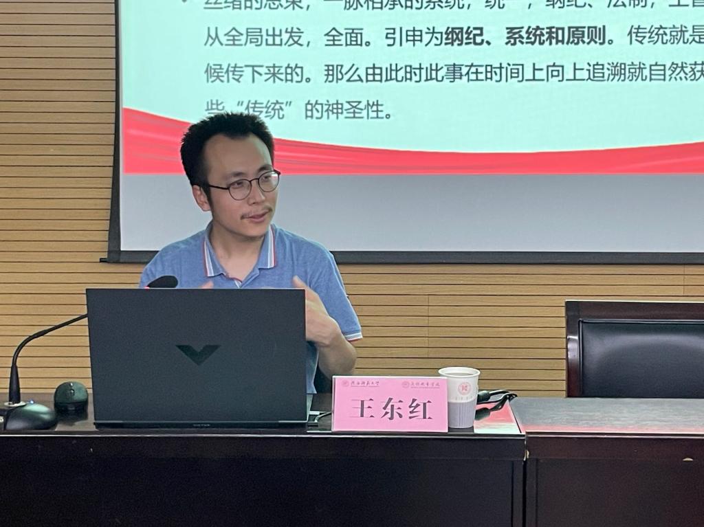 王东红副教授从习近平总书记的系列重要讲话精神引入主题,提出新时代中国青年要“坚定不移听党话、跟党走”。首先,他阐述了党的光荣传统和优良作风形成的基本概念、经典表述、形成条件,讲述了其理论内涵和重要论述,同时逐条详细地解释了伟大建党精神的重要内容,其次,他从“不忘初心、牢记使命”这一终身课题出发将伟大的建党精神与习近平总书记到民族地区视察讲话结合起来,与习近平总书记关于加强和改进民族工作的重要思想结合起来,与中央民族工作会议中的“十二个必须”结合起来,在传承和发扬党的光荣传统和优良作风中坚定信仰、坚守初心、知行合一,增强斗争意识,提高斗争本领,战胜新的挑战的奋进中建功新时代。最后,他希望同学们要坚持敢于斗争、善于斗争的鲜明品格,锤炼斗争精神,增强斗争本领,深刻认识我国社会主要矛盾变化带来的新风险新挑战,勇于攻坚克难,奋力走好新时代的长征路。同时,要学习和发扬党的光荣传统和优良作风,提高政治站位、提升理论自觉、树立问题导向,坚持真学、真懂、真信、真用,推动学习往深里走、往实里走、往心里走。