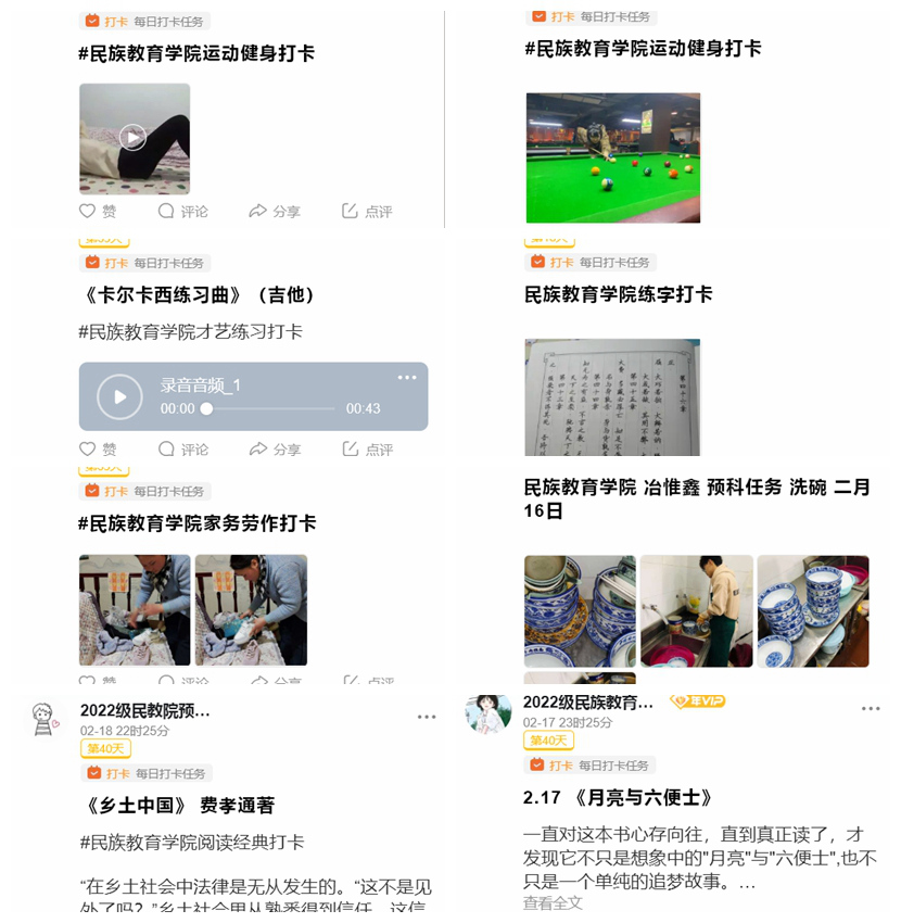 切实落实励学打卡,有效促进学生全面成长。学院引导全体预科生结合个人兴趣爱好和实际,积极参与“励学成长寒假打卡”活动,在经典书目阅读中汲取知识养分、在运动健身锻炼中强健个人体魄、在才艺磨练学习中发掘自我潜力、在家务劳作体验中感受劳动魅力。建立“打卡”圈子,借助“打卡结果共享”的方式在全院范围内形成良好氛围,激励学生良性竞争、不断进步,对于帮助学生养成健康积极、自律向上的良好学习生活习惯发挥了巨大作用。