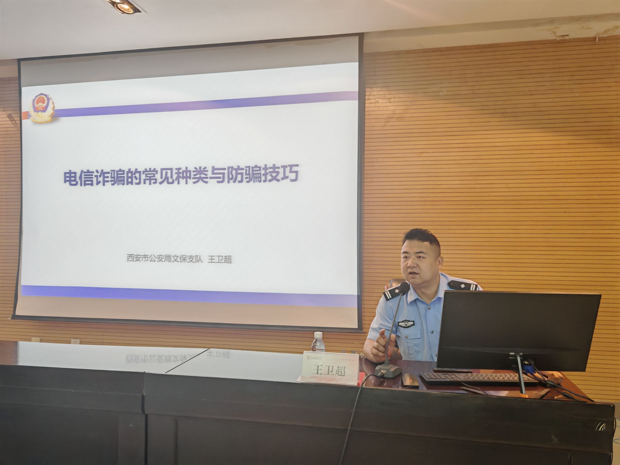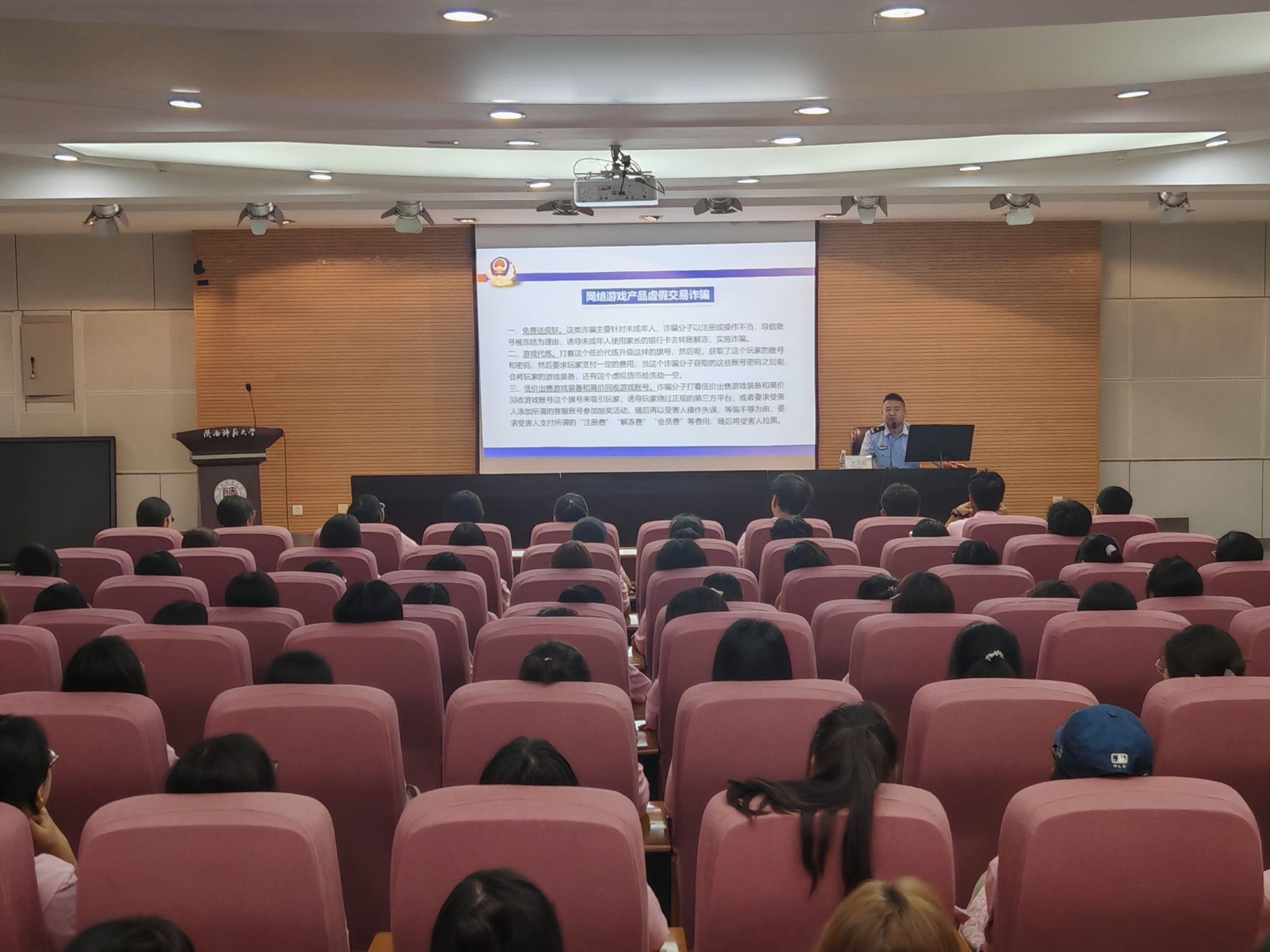 在雁塔校区崇鋈楼归仁堂成功举办了校园网络安全教育专题讲座。本次讲座特邀西安市公安局文保支队四大队副大队长王卫超同志主讲。讲座由学院团委书记热依木·努尔麦麦提主持,2024级全体新生参加了本次讲座。